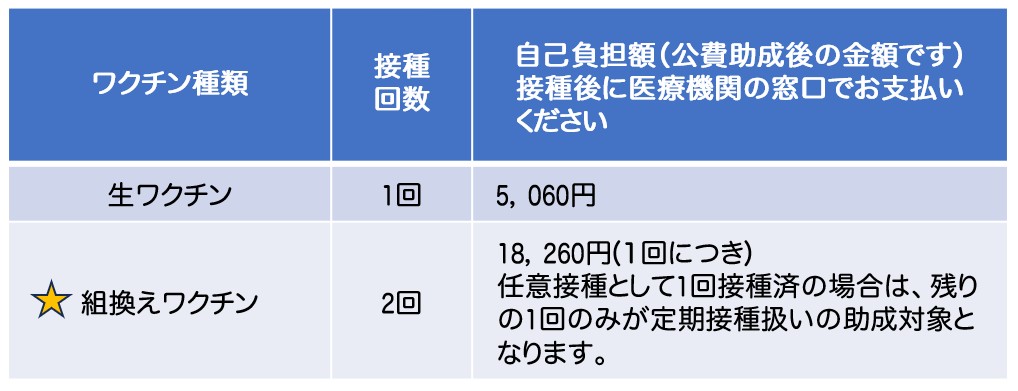 ワクチンは2種類あり、いずれか一方を下表の自己負担額で受けることができます。