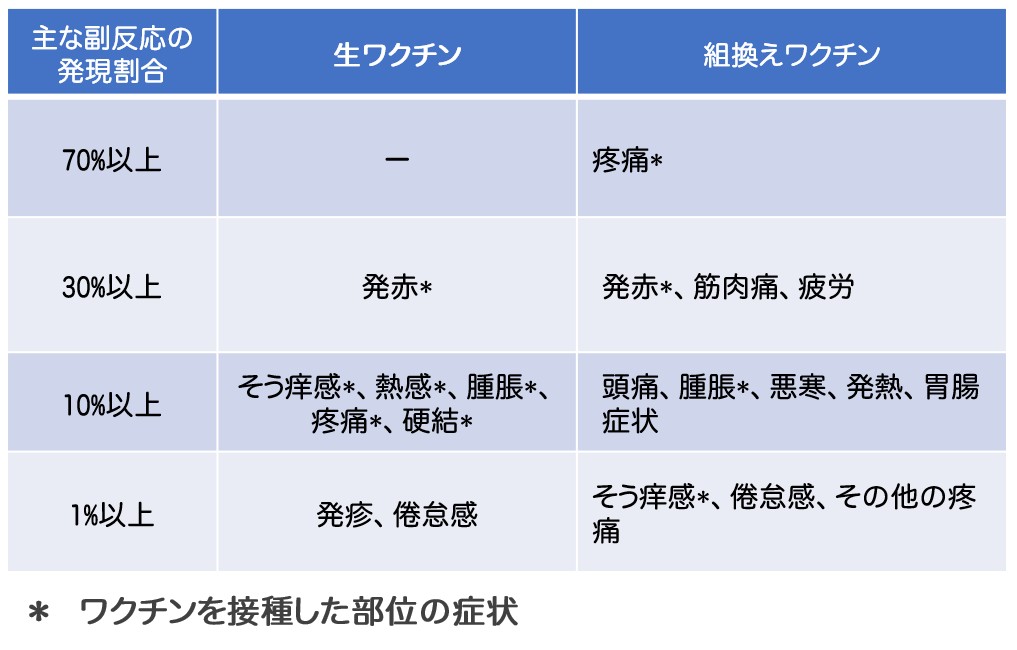 頻度は不明ですが、生ワクチンについては、アナフィラキシー、血小板減少性紫斑病、無菌性髄膜炎が、組換えワクチンについては、ショック、アナフィラキシーがみられることがあります。