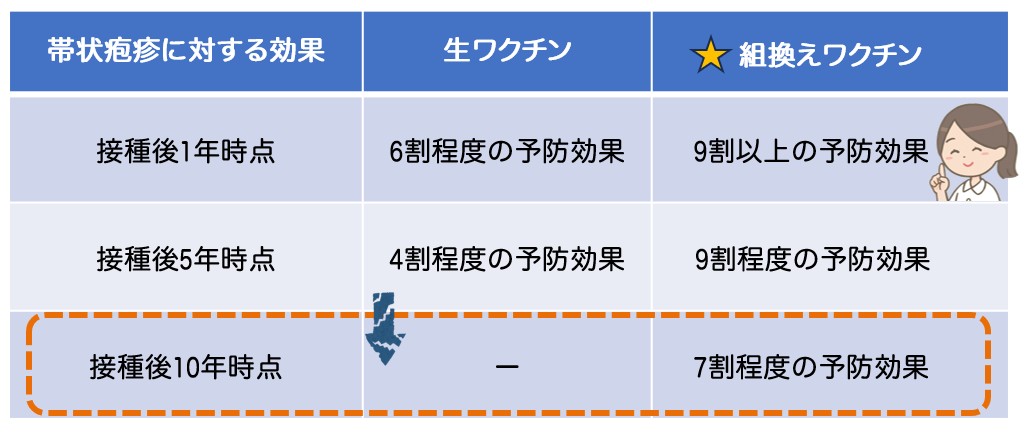 使用されるワクチン2種類は、帯状疱疹やその合併症に対する予防効果が認められています。