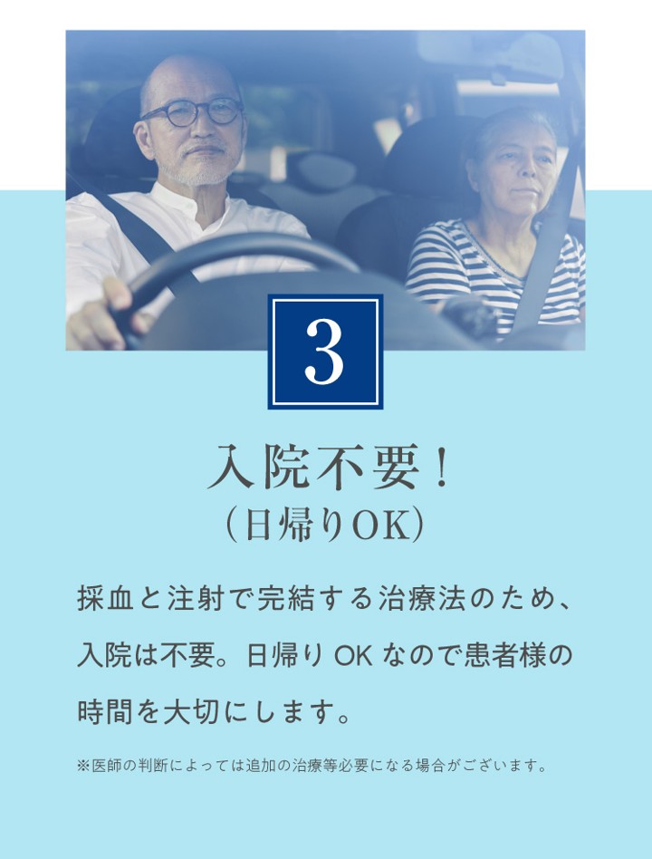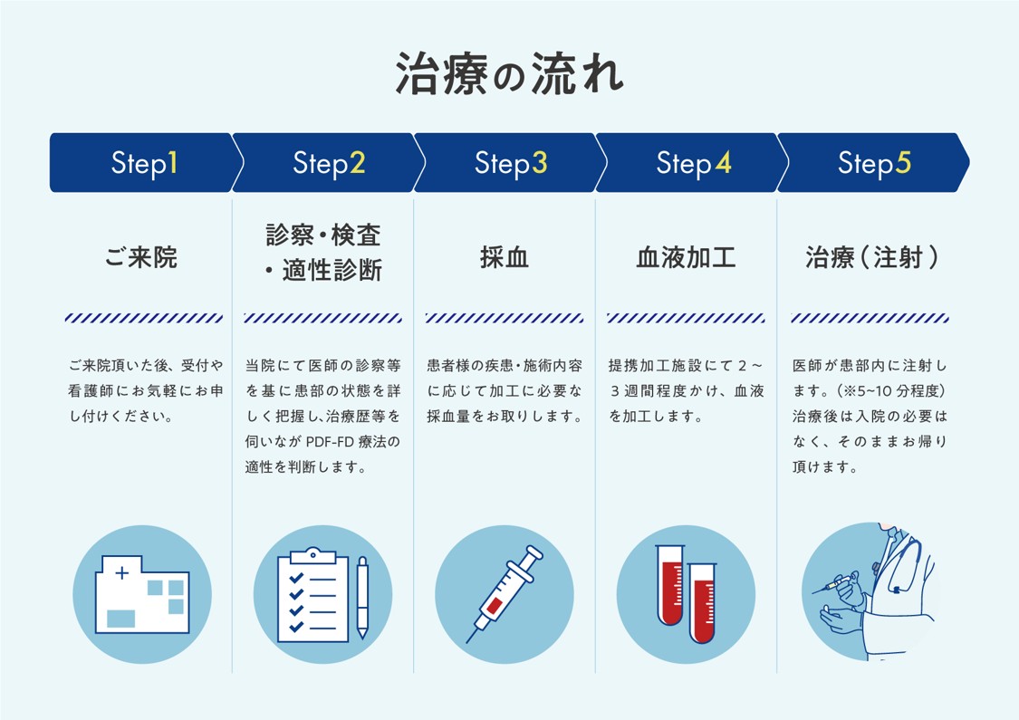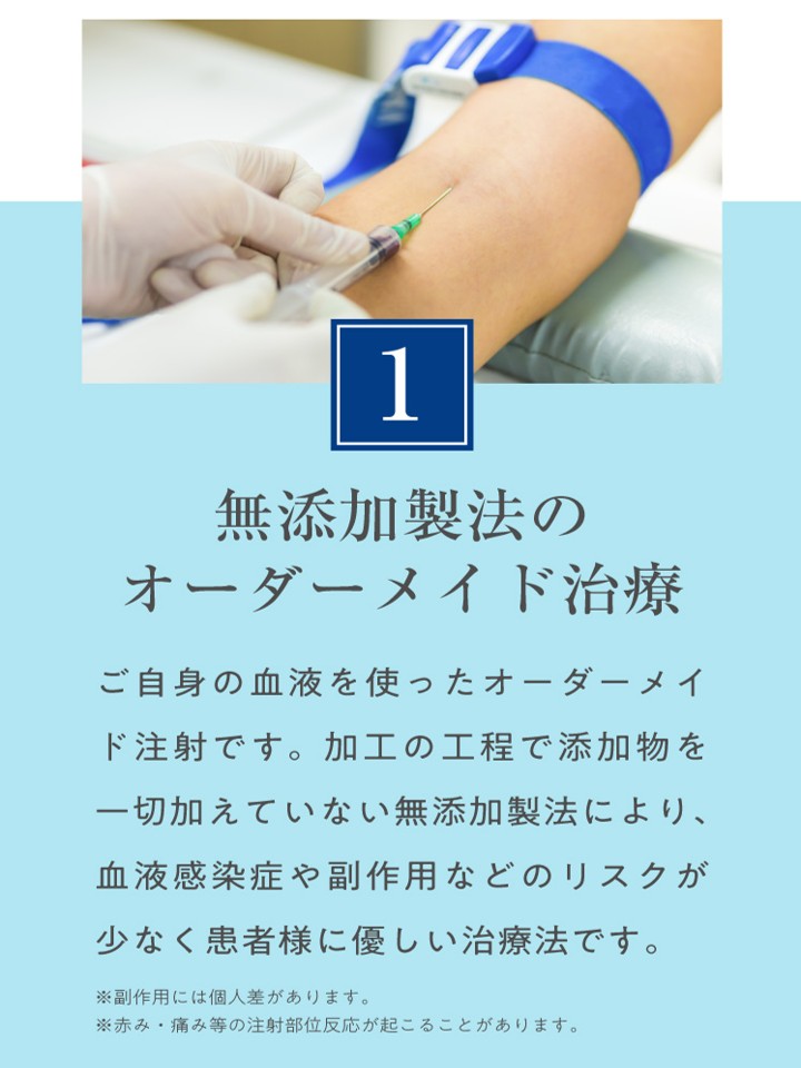 具体的には、患者様ご自身の血液に含まれる血漿から成長因子を抽出し、特殊な加工を施し濃度を高めることで、より多くの成長因子の作用が期待でき、その後、当該成長因子を含んだ注射を局所(患部に)注入する治療法です。